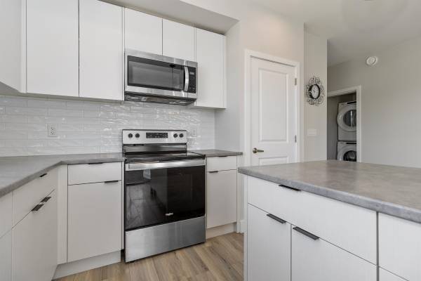 - Modern Kitchen with stainless steel appliances: fridge, stove, dishwasher, microwave