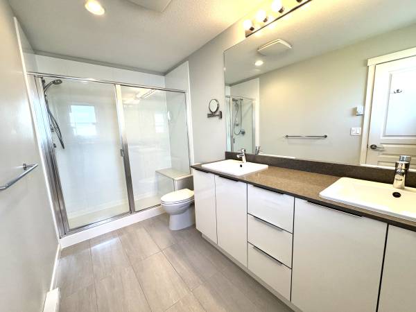Master bedroom + walk-in closet with massive spa-inspired ensuite bathroom with rain shower head and integrated bench seating