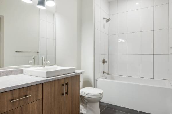 - Tile flooring in the bathroom and durable laminate flooring throughout