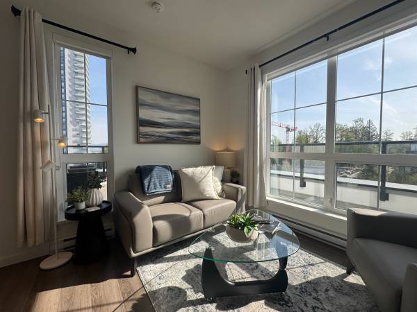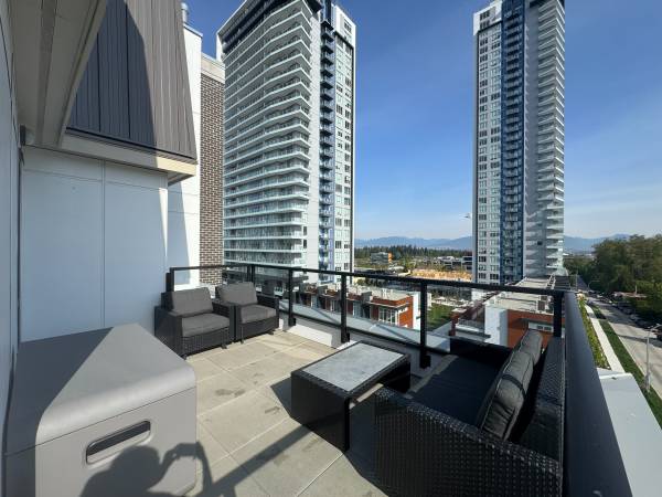 This highly desirable 5th floor one bedroom unit has a stunning panoramic city and Golden Ears mountain view in the newly completing Latimer Village Vesta project. It is a gorgeous sunlight filled West/North/East facing unit, containing a modern full size kitchen, with the newest LG front washer + dryer, efficient Samsung appliances, large master bedroom, walk in closet, stunning floor to ceiling windows, and a uniquely massive approximately 300+ sq ft patio (includes two outdoor lounge sets).