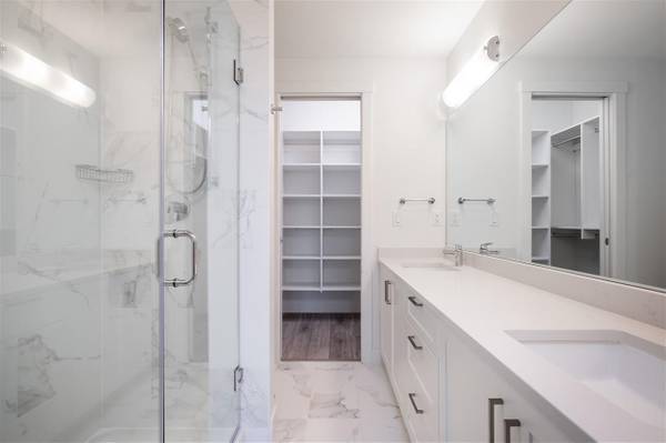 Primary Ensuite — dual sinks with elegant white quartz countertops