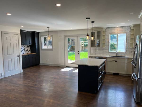 Bright living/dining combo with a chef’s kitchen that features bespoke cabinetry, SS appliances and gas range.