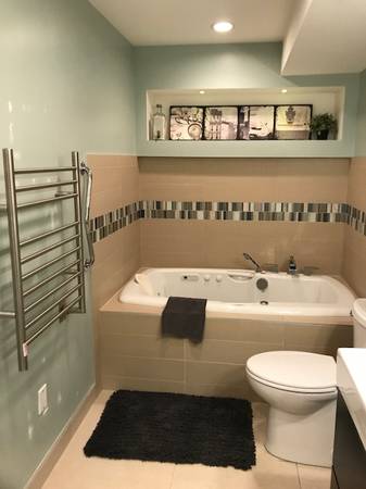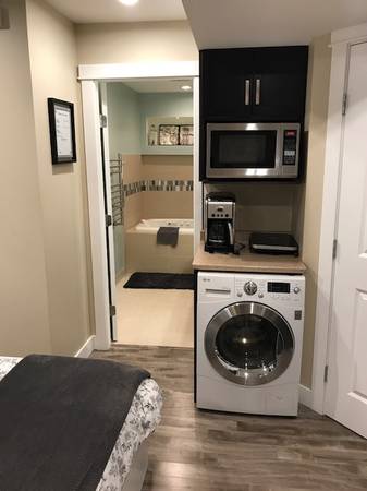 This luxurious studio suite has heated floors throughout, ceiling fan, lots of light, Jacuzzi tub with air jets, towel warmer, all in one washer/dryer, dishwasher, fridge, microwave/convection oven, queen storage bed, smart tv, wall safe, private entrance, fold out table, office chair Smart TV, kitchen items are in suite, etc. This suite has all the bells and whistles and is perfect for a one person. It is only a short walk from the quaint Fort Langley Coffee Shops, Boutiques, Bistros, Museums and across the street from the Fort to Fort Trail connector next to the beautiful Fraser River. It is a short drive to TWU and bus route is nearby.