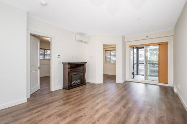 Living & Dining: Bright living area with engineered hardwood floors and a cozy fireplace, opening onto a covered balcony perfect for year-round enjoyment.