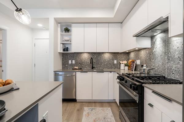 Brand new large, move-in ready 1 bed + den home at Hive 2. Located in Willoughby Town Center with restaurants, shopping & across the street from the indoor and outdoor BBQ and play area. Inspired living built with high quality materials and modern design touches. Wide plank flooring in main living area and den, contemporary roller blinders filter natural light. Full size front stacking in suite laundry, functional kitchen with full size stainless steel fridge, gas range an dish washer. Beautiful bathroom with stylish hardware and undermount sink.