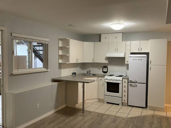One-bedroom semi-basement suite (ground-level, not fully underground) with large windows, bright and comfortable