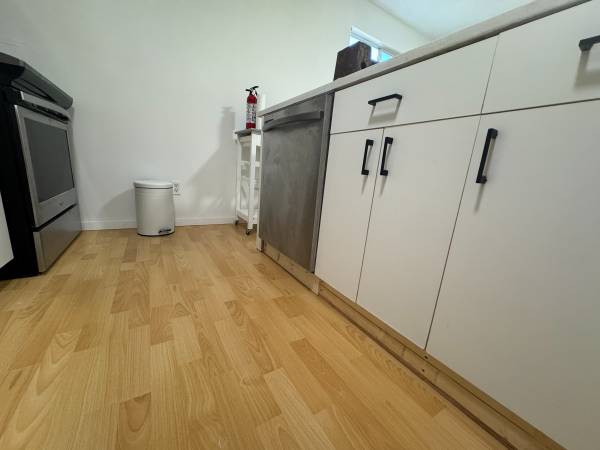 Brand new kitchen with stainless steel appliances, including dishwasher