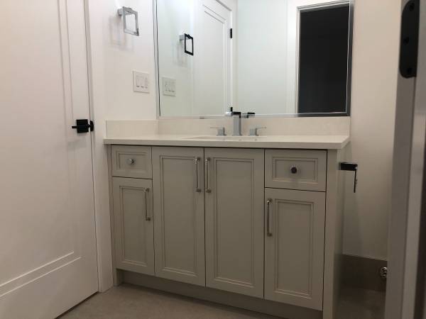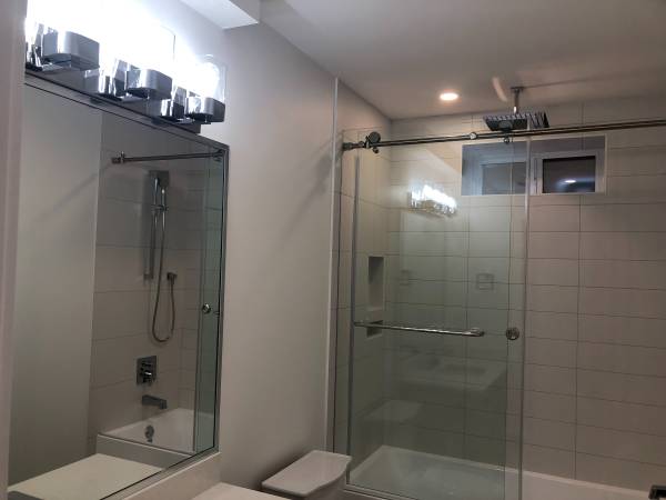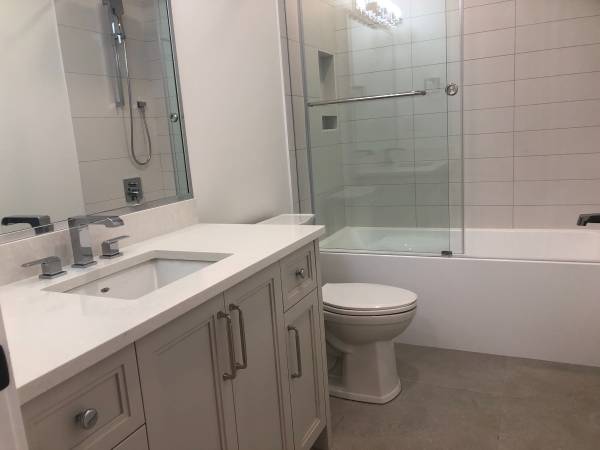 The kitchen is a chef’s dream with quartz countertops, a spacious eat-in counter, and high-end stainless steel appliances, including a dishwasher. The spa-inspired bathroom offers a sleek rain shower, and the suite is complete with full-sized private laundry for your convenience.