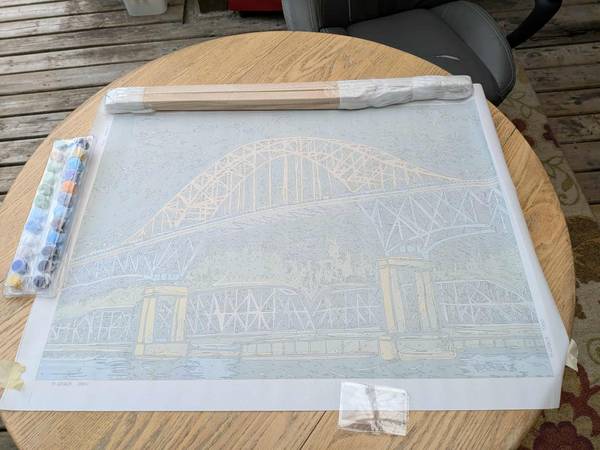 new ,not started paint by numbers of the patullo bridge includes wood frame paint and brushes