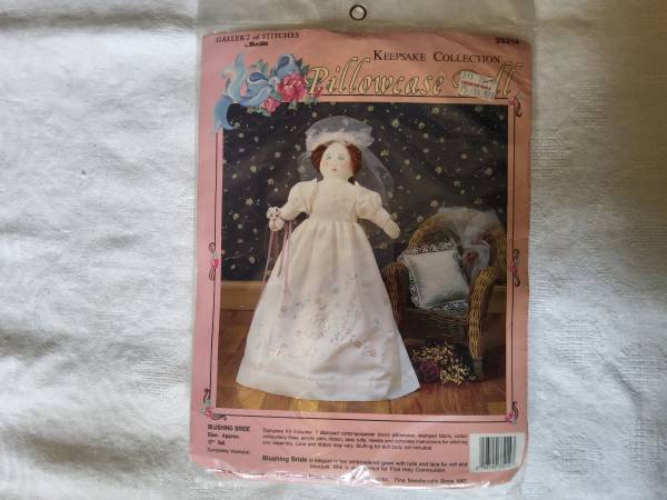 On the left is Bucilla Keepsake Collection Pillowcase Doll Kit, "Blushing Bride".