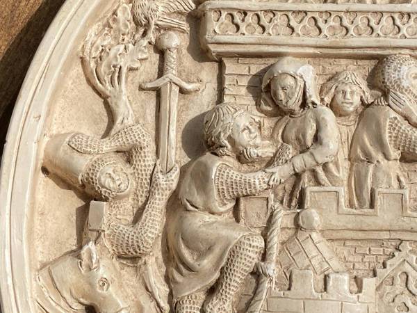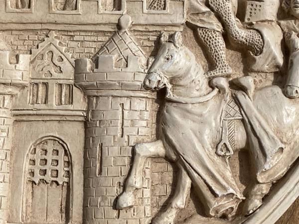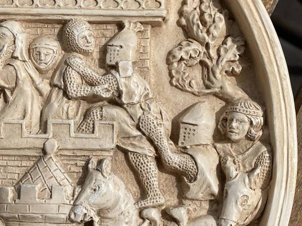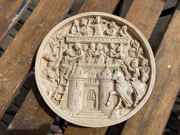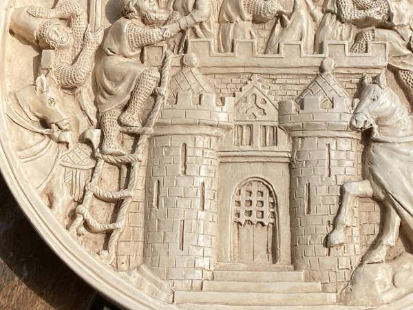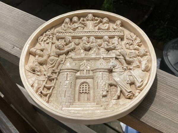 This is an impressive 1975 DH Morton hand sculptured replica of a creation of a medieval scene which was marketed by Marcus Designs