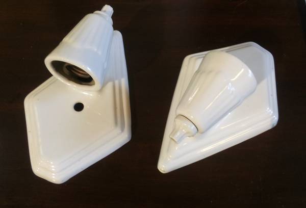 -White Art Deco porcelain scones c/w porcelain switches. Fantastic pair, no chips.