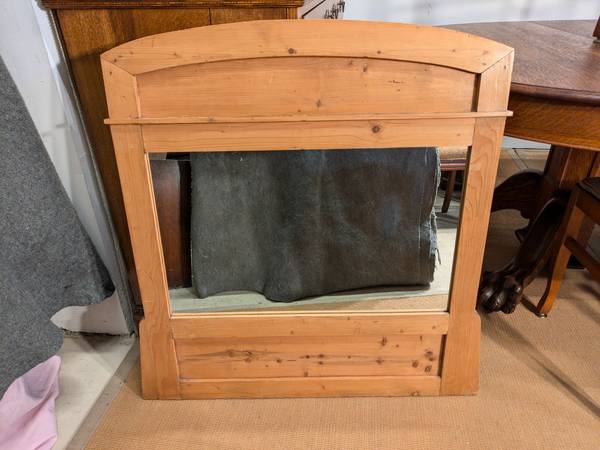 Antique solid pine framed mirror, stripped, and finished. Clean and ready to go. Frame size is 34"wide x 35"tall overall. Add some hooks and hang kid's clothes,keys, mugs, kitchenware, whatever you...