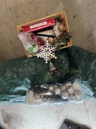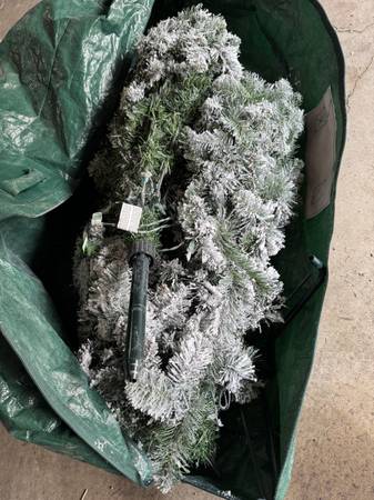 7.5FT Snow Flocked Artificial Christmas Tree Hinged w/1346 Tip and Foldable Base Ornaments & bag tree included Pickup in Surrey