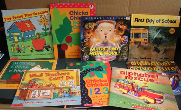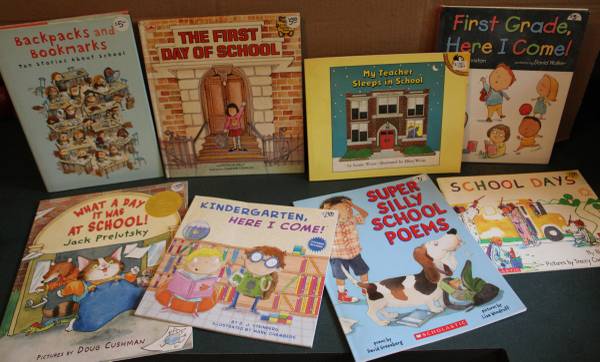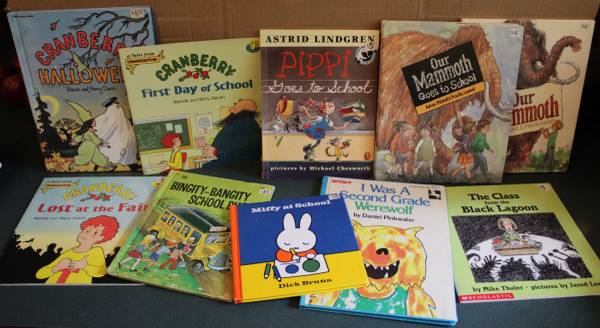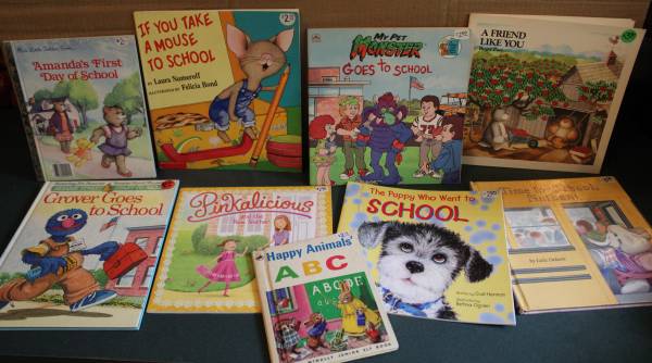 These are books about -- School, Kindergarten, Animals/Hens/Spiders/Monsters at School... buses, going to the country fair