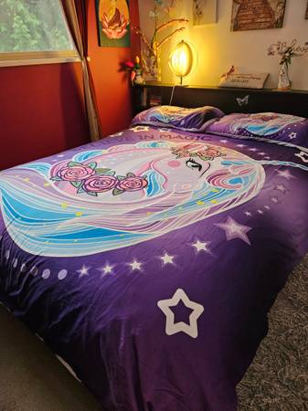 Queen size comforter cover and 2 queen size pillow covers. Please, see pictures, there is a thread snag on the front. That is why the price is so low. 90 long x 88 wide