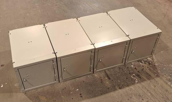 Selling this set of 4 (four) brand new, all steel storage lockers, suitable for cell phone / purse / bag / wallet / backpack / valuables security. Lockers can be used individually, or connected in either a vertical or horizontal orientation. Or even a 2x2 square configuration. Very modular, can be arranged whatever way you like.