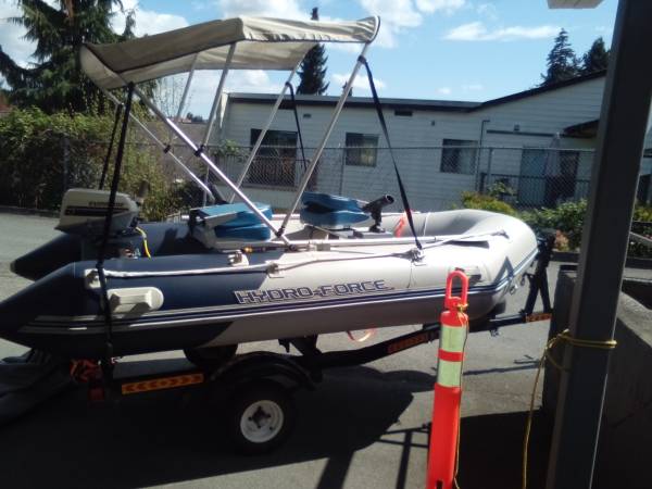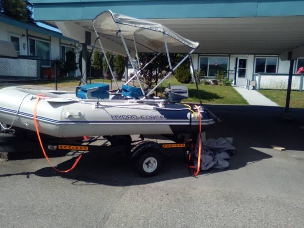 Hydro Force Inflatable Boat 10.5ft on trailer comes with 6 HP motor oars, Bimini top, boat cover,2 swivel Boat seats, rod holders life jackets, air pump anchor boat is in excellent condition trailer has had recently new lights installed boat has 3 pc aluminum floor am open to reasonable offers