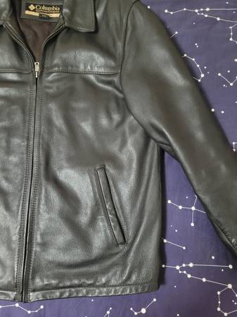 This is a stylish Columbia leather jacket, size medium, perfect for adding a touch of ruggedness to your wardrobe. It's in good condition, showing some signs of wear that give it character, making it a great find for anyone who appreciates quality and style.