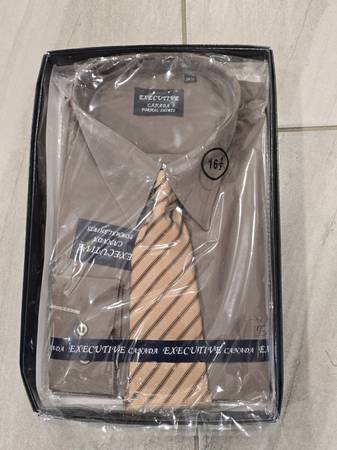Have 3 new dress shirts and tie combo for any formal occassion, weddings, parties etc.. Quality Made in Canada 2 are 16" neck 1 is 16 1/2" neck Asking $38 obo each