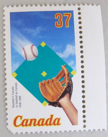 9) $.37 Baseball in Canada 1838-1988 issued September 14, 1988 (Baseball is believed to have evolved from the English game of rounders. The first recorded baseball game was played in Beachville (in Upper Canada, now Ontario), on 4 June 1838)