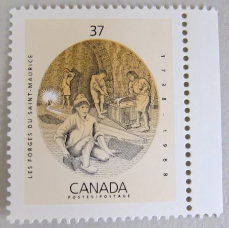 8) $.37 Les Forges du Saint-Maurice stamp issued August 19, 1988 (the Saint Maurice ironworks - were built near Trois-Rivières, Quebec.)