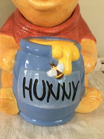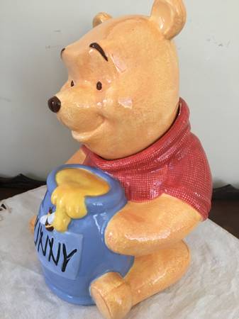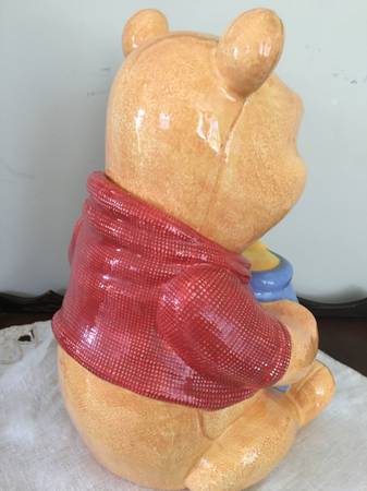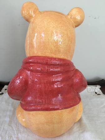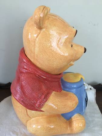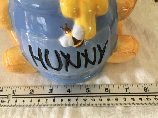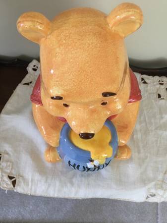 Large Vintage Disney's Winnie the Pooh Ceramic Cookie Jar in very good condition with no cracks or chips. Measures approx `3" tall x 8" wide. $80