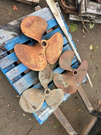 #471 – Old Boat Propellers For Garden Art $250.00/ea Three Old 20” dia boat propellers for garden art. Choose of three at $250.00 each. They weight about 50 lbs each. Check out my instagram postings...