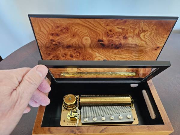 Beautifully hand crafted music box from Sorrento Italy using fine burl wood as shown in pictures. The 72 note mechanism is hand made in Switzerland by the world famous REUGE COMPANY. Each piece is individually numbered as a limited art work. This piece plays three versions of Lara's Theme from Dr Zhivago. Absolute mint condition! Reuge music boxes can sell for 6 figures depending on size. The best is to check ebay and look for a 72 note