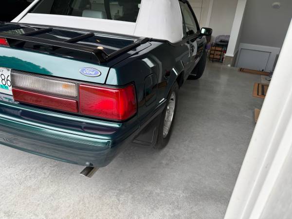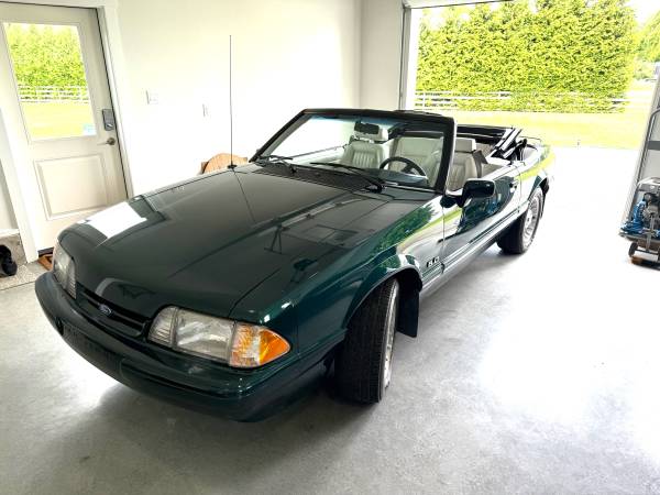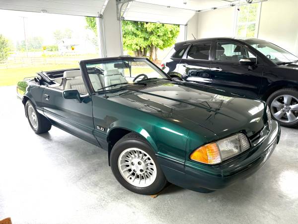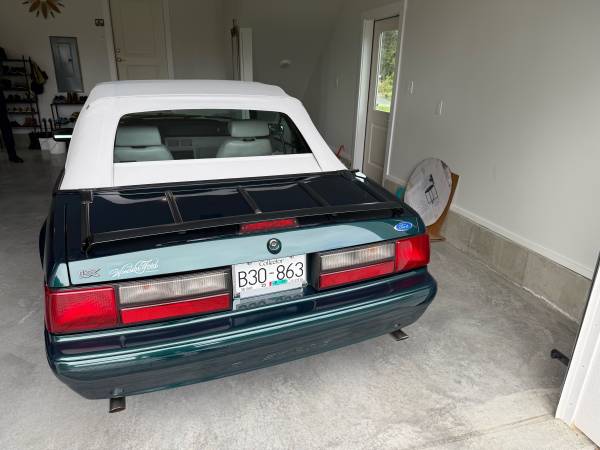 This rare 1990 Ford Mustang LX Convertible is powered by a 5.0-liter 'Windsor' HO V8 rated at 225 HP and 300 lb/ft of torque and a 4 speed automatic transmission. The emerald green Mustang with white leather seats is known as The 7up Edition! Limited Production 4103 were built and 2743 were automatic. One owner since 1990. It was bought new at Windsor Ford in Grand Prairie, Alberta right out of the showroom. Everything is original. This unrestored car even has the original factory installed Goodyear tires. The body is straight with no dents or any marks, the interior is very nice. Has Am FM Cassette radio that still works, power windows, power door locks, power side mirrors, power trunk ,Air Conditioning that blows cold, cruise control and has a power convertible top with a boot cover. The factory turbine wheels are in excellent condition with no curbing marks. Under the hood looks very nice and very clean with no oil leaks. Showroom condition! I have the original bill of sale and all documentation for this car. It has never been driven in the winter or the rainy days and has always been garage kept. Come see for yourself! Chilliwack BC