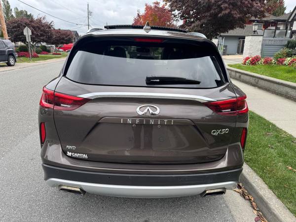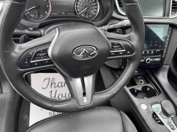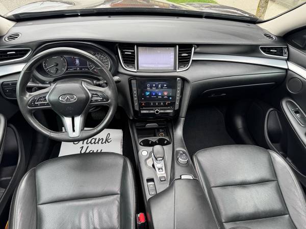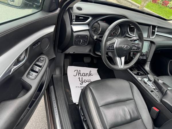 2019 Infiniti QX50 Essential AWD blends luxury, performance, and advanced safety in a sleek and versatile SUV. Powered by a 2.0L turbocharged engine and equipped with All-Wheel Drive, it delivers a smooth and confident ride in all conditions.Heated Front Seats, Bluetooth Integration, Backup Camera, Power Liftgate, Lane Departure Warning Turbocharged,Aluminum Wheels,4-Wheel Disc Brakes,Brake Actuated Limited Slip Differential,Tires - Rear Performance,Integrated Turn Signal Mirrors,Sun/Moonroof,ABS,Brake Assist,Power Mirror(s),Generic Sun/Moonroof,Tires - Front Performance,Heated Mirrors,Knee Air Bag,Bluetooth Connection,Passenger Vanity Mirror,Front Collision Mitigation,Driver Adjustable Lumbar,Auxiliary Audio Input,Keyless Start,MP3 Capability,Immobilizer,Back-Up Camera,Mirror Memory,LED Headlights,Remote Engine Start,Pass-Through Rear Seat,Smart Device Integration,Front Side Air Bag,Floor Mats,Requires Subscription,Blind Spot Monitor,Driver Vanity Mirror,Passenger Air Bag Sensor,Telematics,Universal Garage Door Opener,Front Head Air Bag,Tire Pressure Monitor,Rear Head Air Bag,Multi-Zone A/C,Rear Bench Seat,Heated Front Seat(s),Aerial View Display System