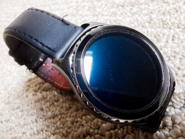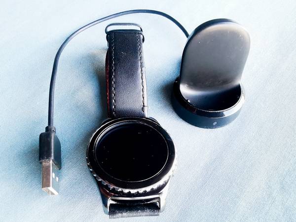This Samsung Gear S2 Classic watch is in very good cosmetic condition and it has a good leather strap. Although this watch is working, it is sold without any guarantee because the battery is very weak and must be replaced at your risk. The original wireless charger, USB cable, large strap (the part with holes) and box are included.