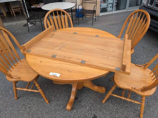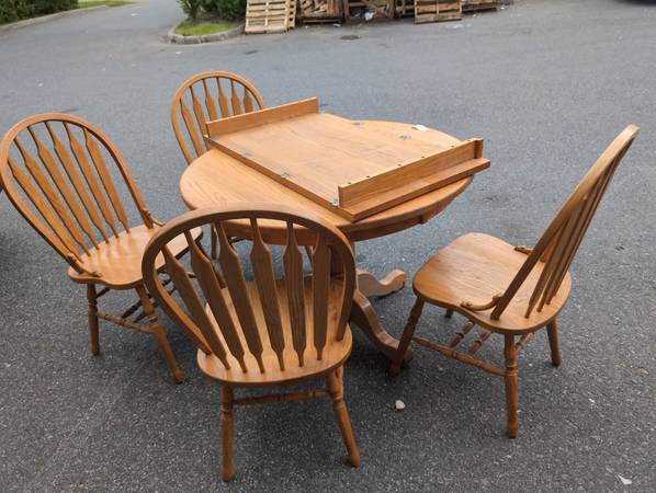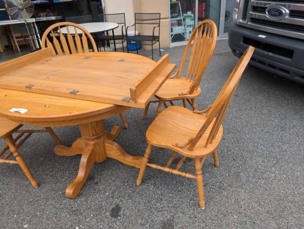 OAK DINING TABLE WITH LEAF AND 4 CHAIRS IN EXCELLENT CONDITION. Single Pedestal Measurements are: Delivery can be arranged. Viewing and picking up by appointment. Number 2505204
