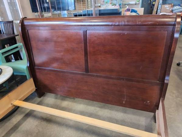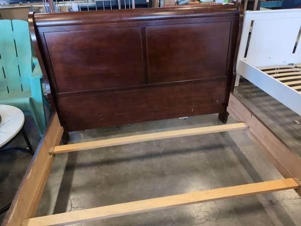 QUEEN SIZE SLEIGH BED FRAME WITH SLATS In very nice condition. Measurements: 78" long by 60 1/2" wide by 44" high Delivery can be arranged. Pickup and viewing by appointment. Number 2504507