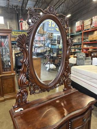 SOLID WOOD ANTIQUE 4 DRAWER DRESSER + MIRROR.