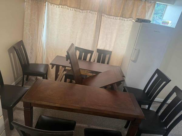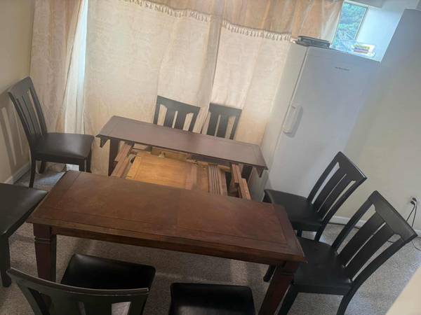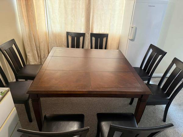 A very beautiful and strong solid wood dinning table set in great shape. The sizes make it easily able to accommodate for 4-8 seats
