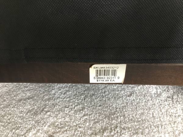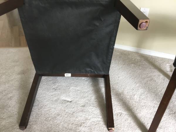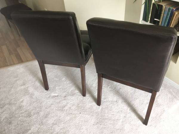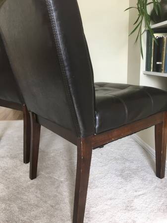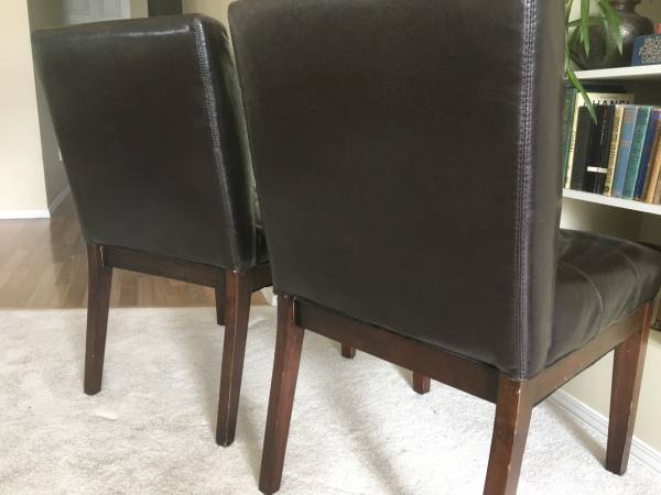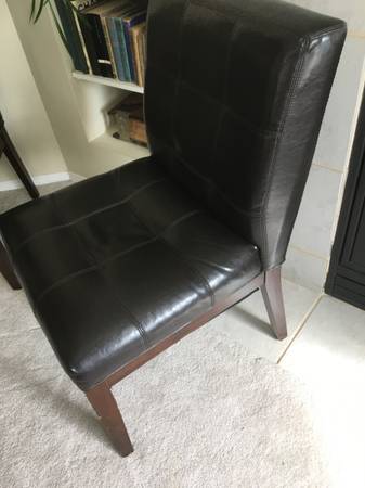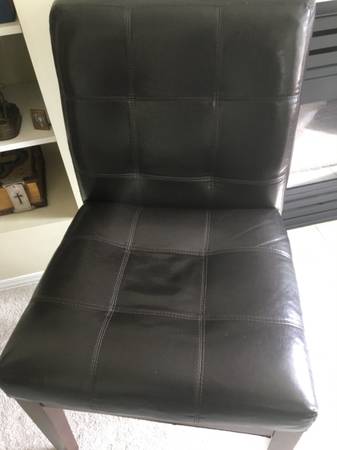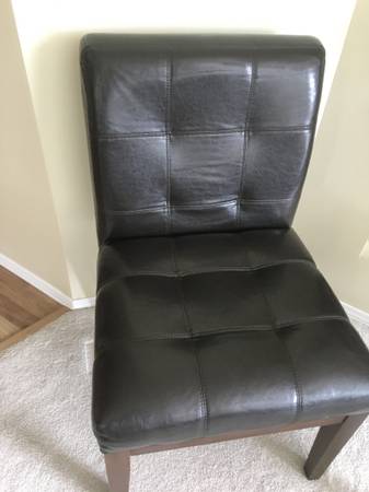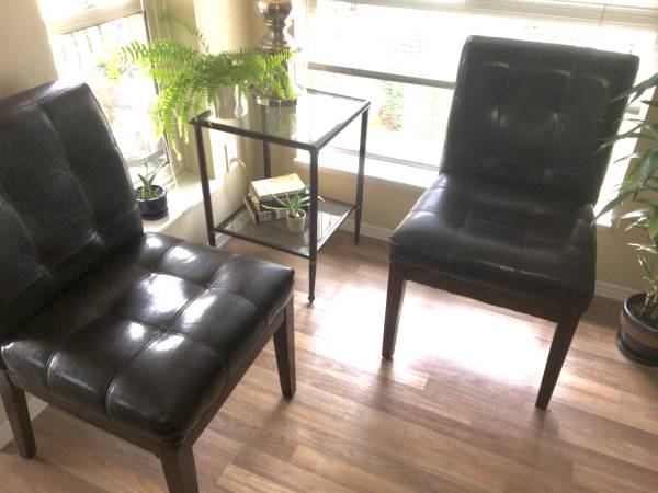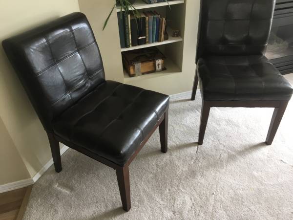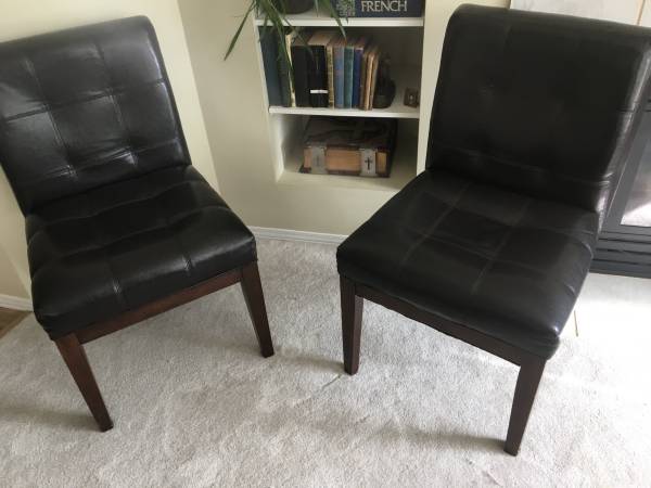 Two Matching Black Accent Side Chairs tufted faux leather, wood legs, in good condition with no rips or tears, firm, solid and comfortable. Each Chair stands 34" tall. Seat is 20" wide x 17" deep x...