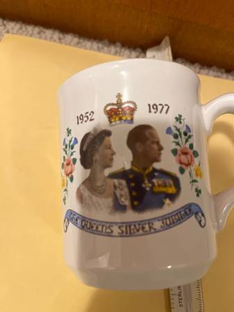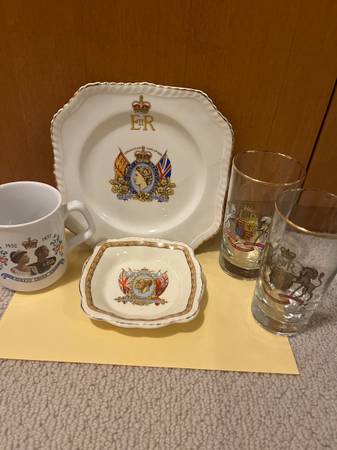 5 pieces of commemorative dishes for the coronation of Queen Elizabeth 1953. Gold trimmed cake plate. 71/2”. Candy dish 5”. Mug and two 5” glasses. Take all for $35!! Pick up near Hazelmere golf...
