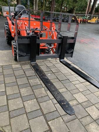 BE skid steer attach, 48” adjustable forks, removable center inset for skid steer door opening. “D” ring. Made in China $1250