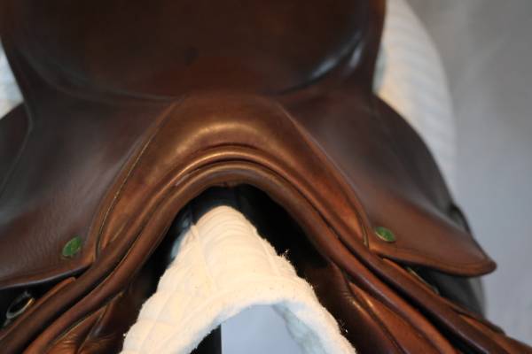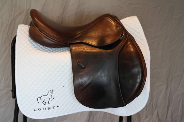 Used County Innovation Saddle. Bought used several years ago and was a very comfortable ride, reason for selling is it no longer fits my current horse. Has front gussets and skid row panels, as well as adjustable velcro knee blocks and fixed in place thigh blocks. Minor wear and tear from use shown in the last couple of photos, all hidden by rider's leg and saddle flap. I believe parts of it are bull leather as well (underside of skirt above the stirrup bars shows texture well)