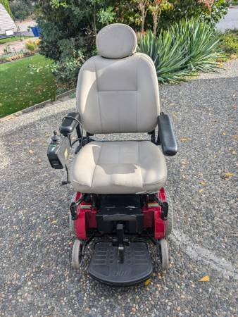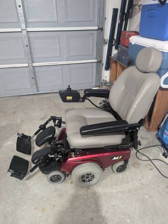 This Jet 7 model has new tires, and recently replaced batteries, the chair has been kept and maintained indoors at all times. It also has two leg extensions that go with the chair. This chair is very comfortable as it has a high-density foam seat and back cushion. The chair was bought new by my uncle, and he used it for about two years when he was in a home. The chair has a built-in electrical charging system that works great and easy to use with a battery level indicator.