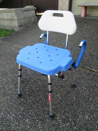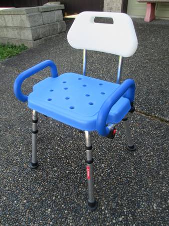 .Lifecare bath chair with drop down armrests, soft padded removable seat cover, seat is 17 inches wide, removable back rest, adjustable height legs. Is in LIKE NEW condition. . .Please phone talk or...