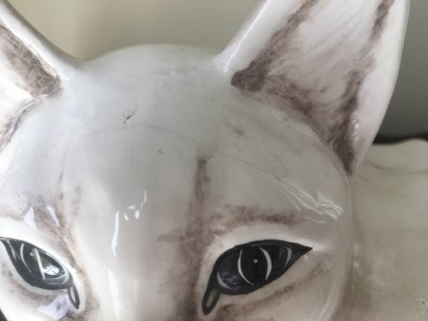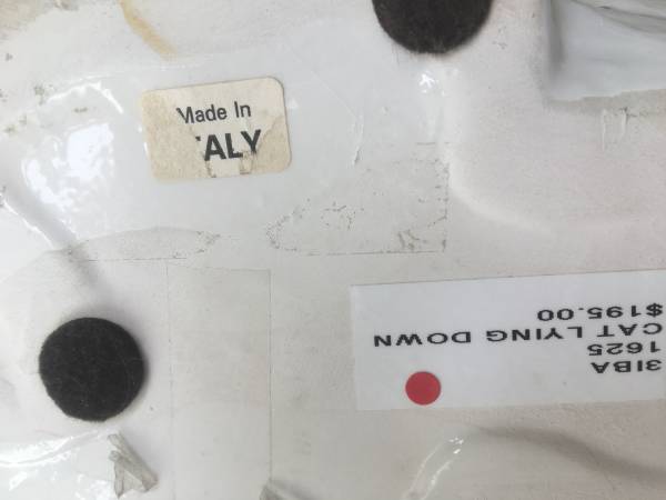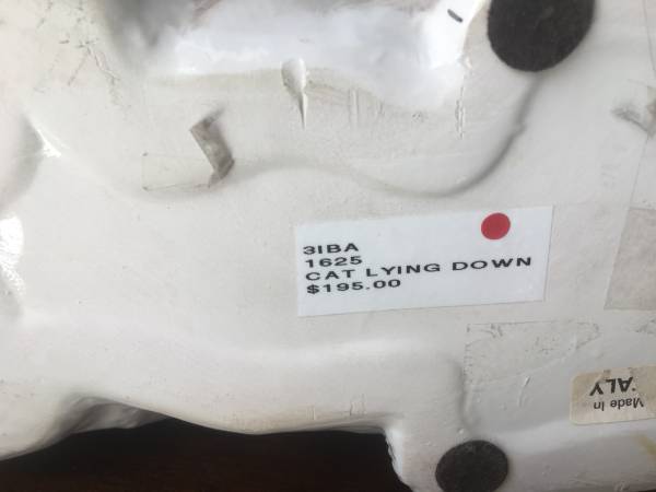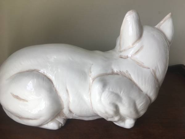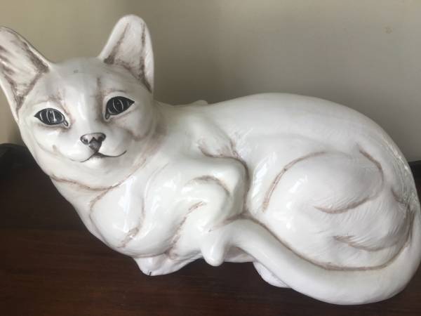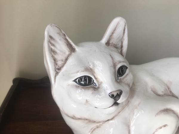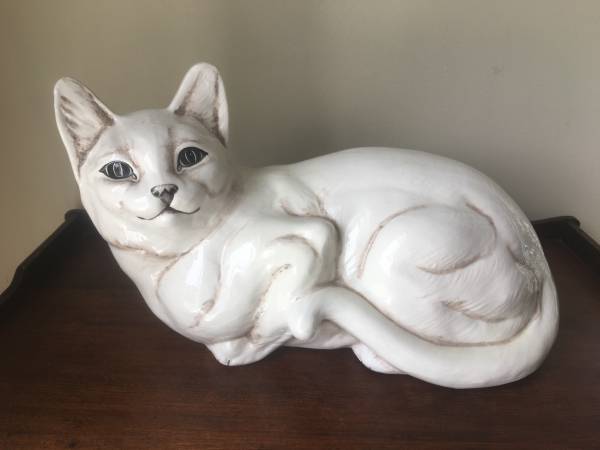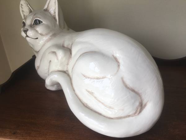 Large Ceramic White Cat, Made in Italy, in good condition with some crazing and a few small flaws. Measures about 12-1/2" long by 6-1/2 wide by 7-1/2" high. $15