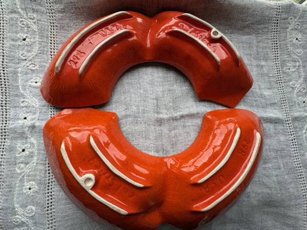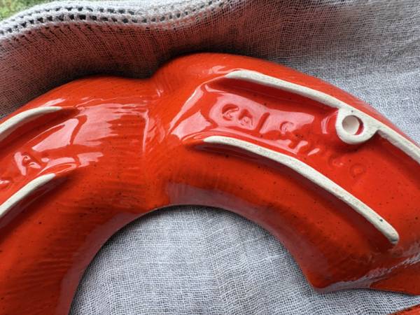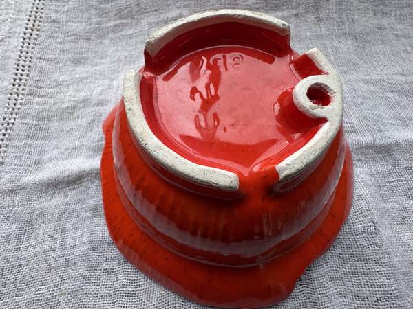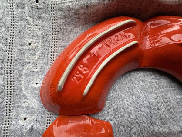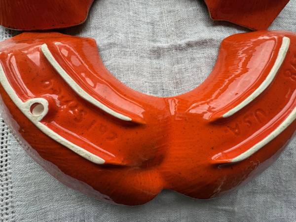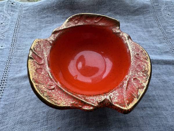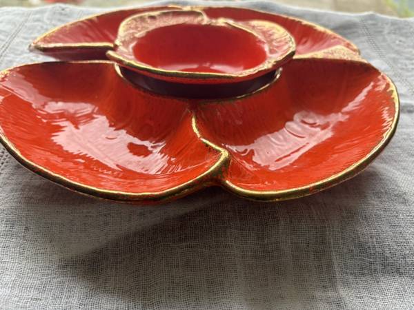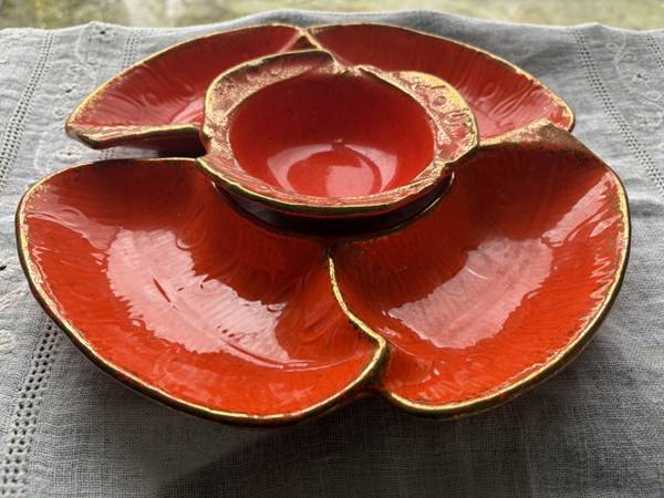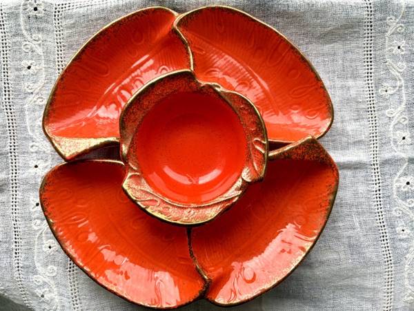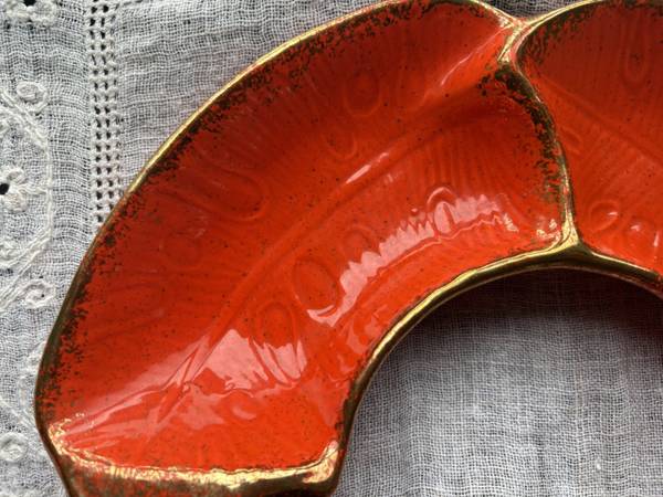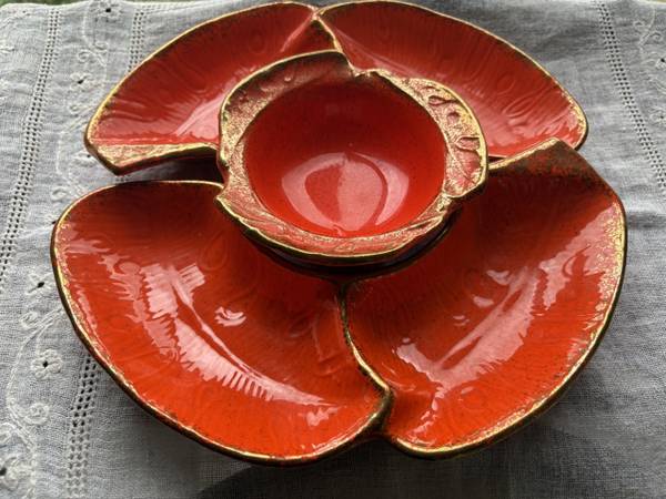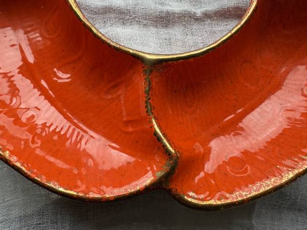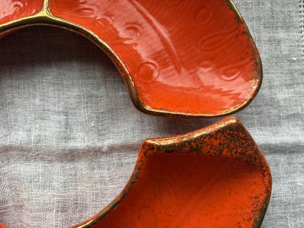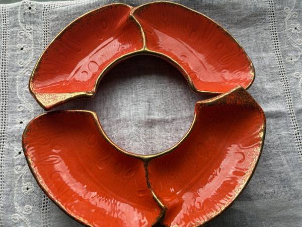Glazed Brilliant Orange with Gold Trim Three-Piece Vintage dip/snack serving pieces made by Cal Style Ceramics, #298 (imprinted on underside). The dip bowl measures 6" tall x 2-1/4 wide. The assembled set has a 12" diameter. Each long piece has an extended overlap on one end. All three pieces are in very good vintage condition with no fleabites, chips or crazing. The photos are a bit dark as they were taken on a rainy day. $40