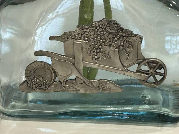 This old bottle is so incredible looking with it's lovely pewter depiction of a cart of grapes including a goose in the foreground on the front side of the bottle