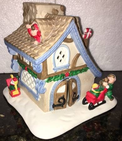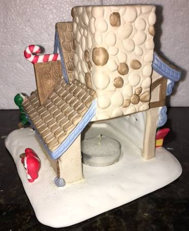 Ceramic tea light holder. In new, unused condition. Light the tea-light and its light flickers through the windows. Stands 5.5in tall x 5.5in x 5.5in at "snow" base. With original packaging. Pickup...