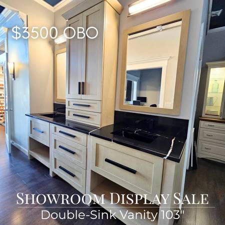 SHOWROOM VANITY DISPLAY for SALE Stained Alder Double-Sink Vanity 104”W x 22 ¾”D x 36"H The 63”H cabinet sits on countertop, totaling 99”H incl crown, can be modified to suit your ceiling height....