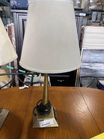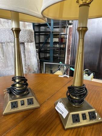 PAIR OF MATCHING BRASS LAMPS WITH POWER OUTLETS In pretty nice condition. Complete with shades Measurements are: 6 inch square base 25 inches tall 12 inch diameter shade. Delivery can be arranged...