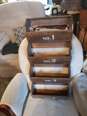 WOODEN WALL ORGANIZER In perfect shape. Does need dusting. This may come in handy for someone out there. Measurements are: 28 1/2" tall by 4 1/4" deep by 13 1/2" wide Viewing and pick up by...