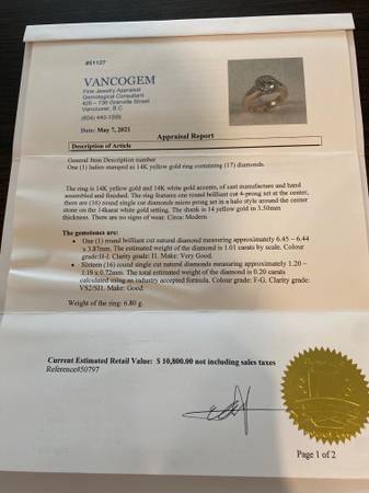 This exquisite 1.01-carat engagement ring is a true symbol of love and commitment. It features a brilliant color grade H-1 diamond at its center, surrounded by 16 sparkling accent diamonds. The clarity grade is I-1, and the ring comes with a professional appraisal, a picture is attached here.